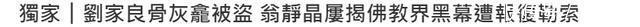 而刘家良的龛位,石碑表面完好,未见有被撬痕迹,可见盗匪手法专业。 据港媒得到的消息,宝福山职员约于今年8月下旬致电翁静晶,表示刘师傅骨灰被窃、能否让警方查证,由于翁当时不在香港,遂授权警方调查,警员当日下午证实事件,指龛位内仅剩一块红色布、一块黄色布和刘家良生平纪念册。除了刘家良外,还有多位名人富豪的骨灰都被盗了。