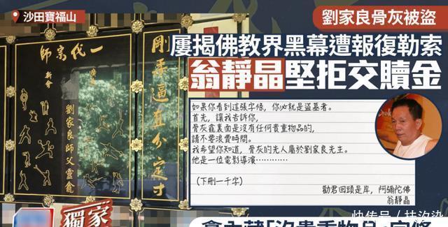 翁指出,龛位亦存放了她在办理丧事期间书写的字条,内容指“这处是刘家良墓地,没有值钱物品,只有骨灰,请不用盗走”,没想到一语成谶,如今该字条也不翼而飞。。 由于宝福山负责看管骨灰,翁已委託法律代表与其交涉,要求赔偿。此外,她已向警方表明,不会向盗匪支付赎金。