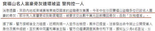 原来,港媒得到独家消息,称一个怀疑来自内地或者柬埔寨等地的盗窃骨灰集团,早前来港连环作案,在沙田宝福山盗走多位名人明星名人富豪的骨灰,部分先人的家属更收到勒索千万巨款的电话,威胁如果不给,会让骨灰“灰飞烟灭”。 目前,警方已经接获报案并拘捕一人。据悉,至少有4名匪徒,分别负责盗窃和勒索。案中同党和幕后主脑,警方仍继续调查其身份和下落。